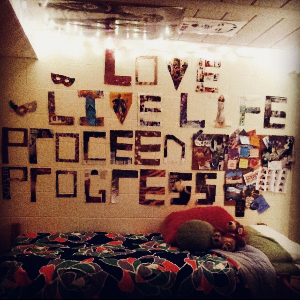 Now I’d love to share my current vision board with you all but because I believe that some aspects of our desires must be kept sacred and protected (in order to ward off negative energy), I am choosing to show you pictures of some older vision boards that I’ve made. Below are collages that I had on the walls of my bedroom at home and at school. When I looked at them, I would read the words aloud to reinforce them.
