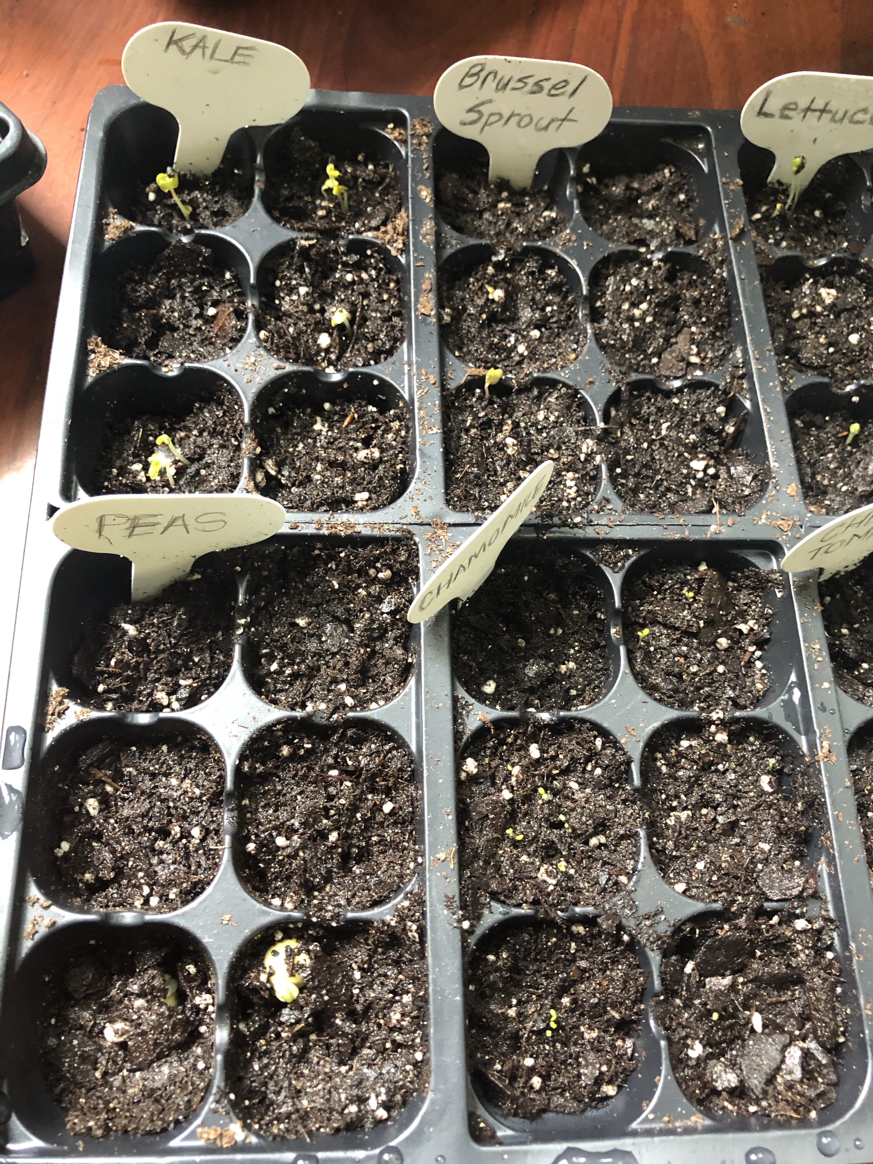 This morning I checked on the seeds that we planted on Monday, May 24th, and they’re growing already! Five plants have already started sprouting: kale, brussels sprouts, lettuce, peas, and chamomile! It’s only been two days. That’s so exciting and I can’t wait to see how they look a week from now.