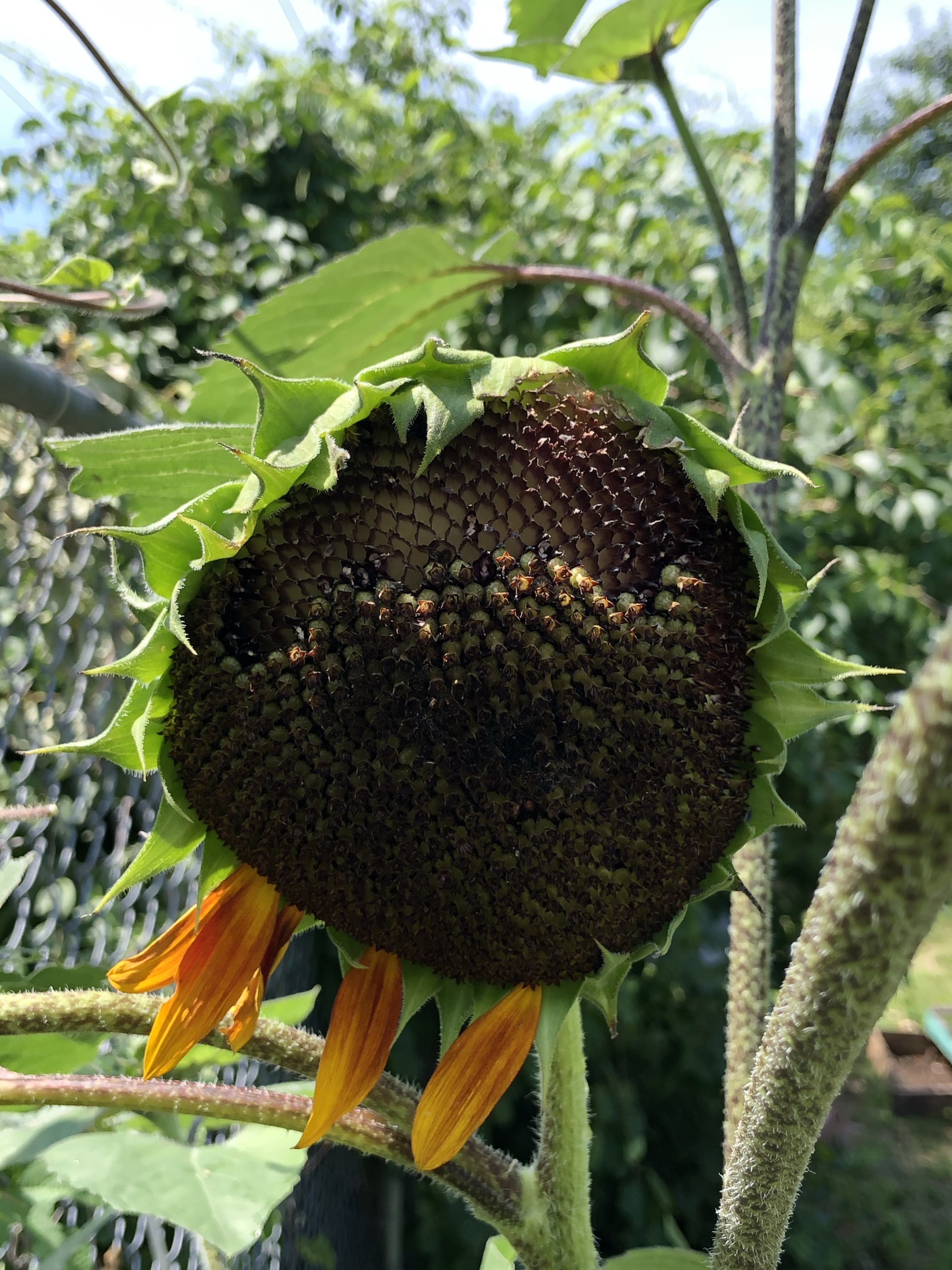 The sad part is that the sunflower seeds haven’t even fully developed yet. They aren’t the tough bodied shells that we are used to. Upon touching them, I found them to be soft and fluffly and sometimes a whitish purple in color. The birds visit the flowers every time they bloom and peck at them until all the seeds are gone! I was actually hoping to harvest the seeds by the end of the summer so that I can have them to plant next year. So needless to say, this was REALLY disappointing to witness.