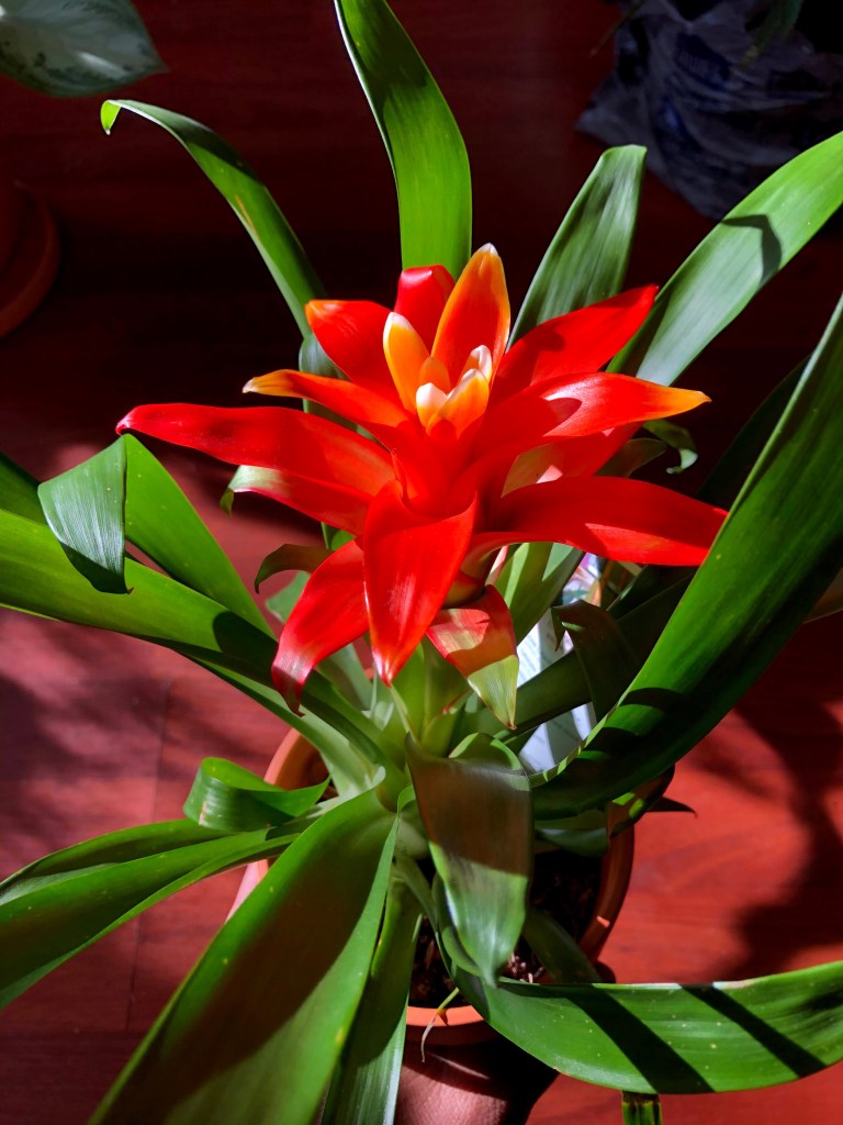 Bromeliads have long leaves that stand upright and that surround the flower, almost as if to protect it. I’d describe the plant itself as small to medium sized (don’t let the picture above fool you). They prefer regular watering – 1 to 2 times per week – and moderate temperatures (above 50°F). Since I can’t be in the tropics right now *sigh*, why not bring the tropics to me? And I just seriously love the flower!