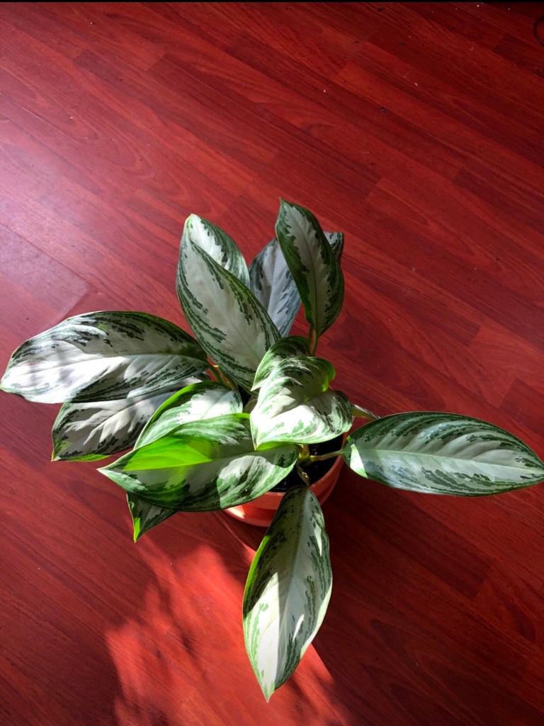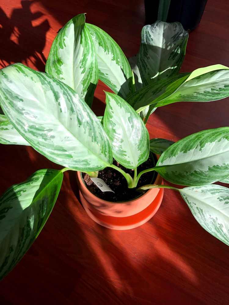 Aglaonemas prefer medium to bright indirect light and warmer temperatures (65 to 85 °F). They also like to be watered a bit infrequently so that the soil completely drains and dries before being watered again. Having added it to the shelf above my bed, its’ long and luscious leaves hang over the edge in such a graceful way that makes me feel very royal.